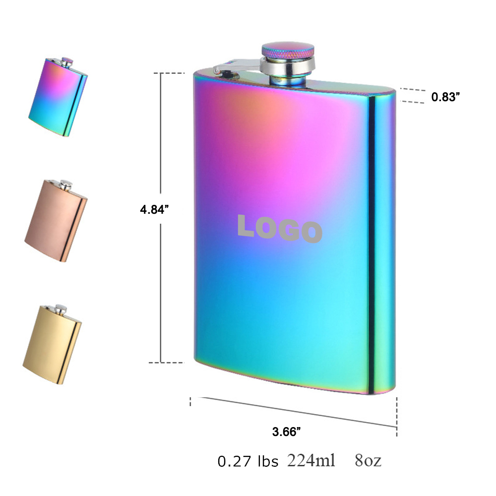 Create a standout promotional gift with this custom iridescent electroplated 8oz stainless steel hip flask. Designed with a vibrant rainbow finish and professional laser engraving, it is perfect for branding, events, and personalized gifts. The durable structure and premium finish make it ideal for long-term use.